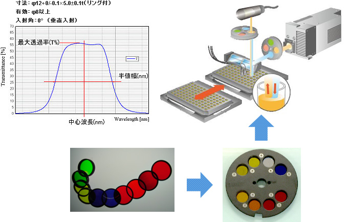 光のスペクトルから特定の波長の光だけを選択し透過させるフィルタです。“ファブリー・ペロー干渉計”の原理を利用した非吸収性の誘電体膜で構成されたバンドパスフィルタです。血液検査装置や免疫反応を調べる分析装置などで使われています。